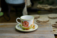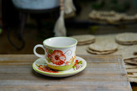 Make your coffee moment vibrant with this handcrafted ceramic mug. Paired with its matching saucer, it is hand-painted with a floral design in warm orange and green tones, evoking energy, freshness, and a natural style. The green glazed rim adds a delicate touch that enhances the design.