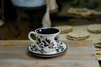 Experience the beauty of minimalism with this handcrafted ceramic mug. Paired with its matching saucer, it is hand-painted with a black floral design on a white background, evoking elegance, sophistication, and modern style. Its glossy black glazed interior adds a refined contrast that enhances its artisanal character.