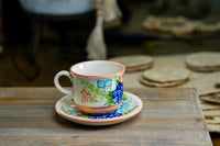 Bring joy and color to your coffee ritual with this handcrafted ceramic mug. Paired with its matching saucer, it is hand-painted with a floral design in shades of blue, green, and orange, evoking freshness, vitality, and a vibrant style. The orange glazed rim adds a delicate finish that highlights the piece.